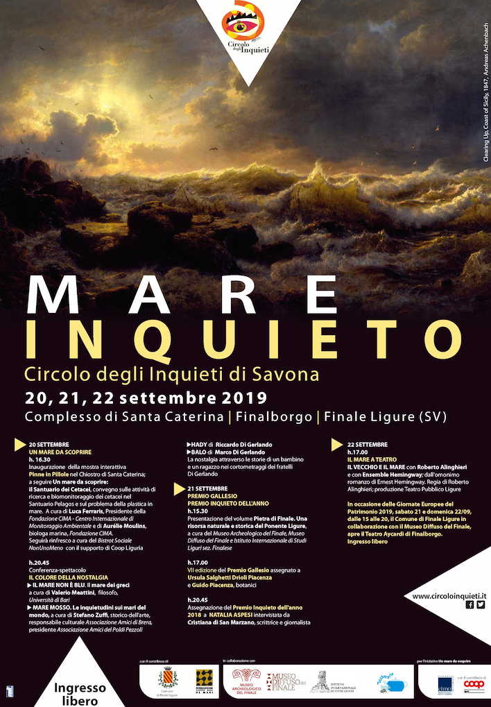 MARE INQUIETO si svolgerà venerdì 20, sabato 21 e domenica 22 settembre 2019 e vede il sostegno del Comune di Finale Ligure che a partire dall’anno scorso è tornato ad ospitare, dopo alcuni anni di assenza, i progetti promossi dal Circolo degli Inquieti.