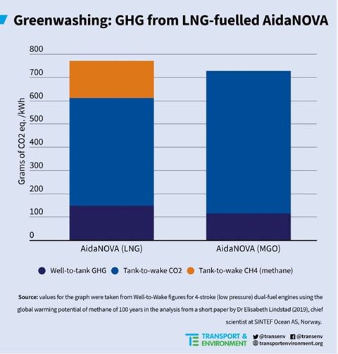 Transport and Environment, basandosi sulle specifiche dei motori di AidaNOVA, le stesse di Costa Smeralda, e sui dati della dott.ssa Lindstad, ha stimato l'impronta di gas serra di AidaNOVA con GNL o se ipoteticamente fosse alimentata a gasolio marino.