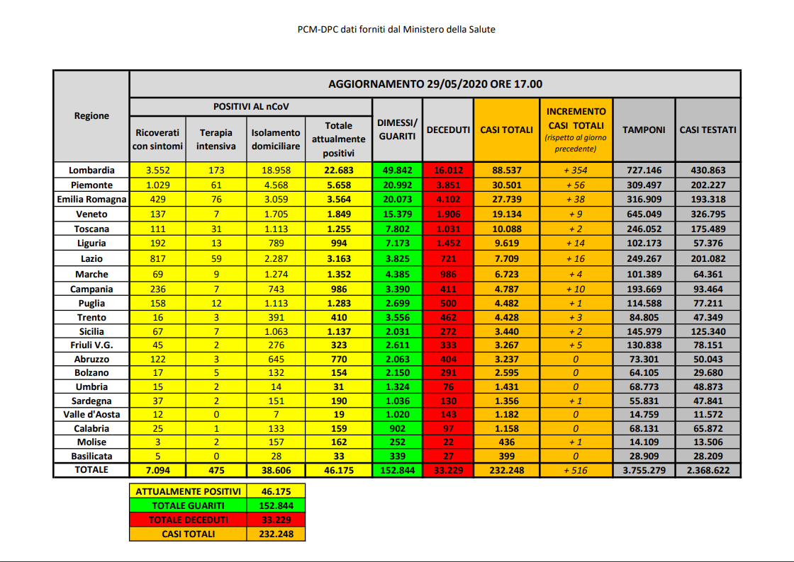 I dati nazionali sono in linea con gli scorsi giorni: continua a calare la pressione sugli ospedali (chissà cosa ce ne faremo delle valanghe di ventilatori comprati da Arcuri), le vittime totali sono 87 e il contagio è stabile con quasi il 70% dei nuovi casi saldamente piazzato in Lombardia.