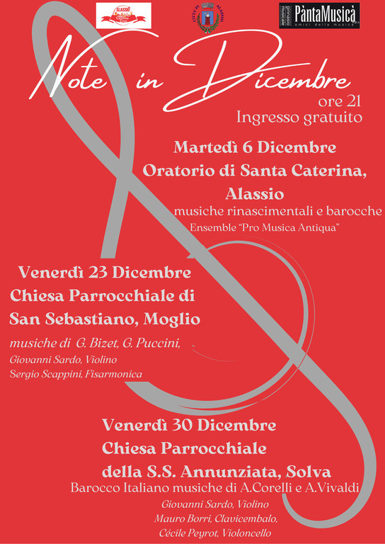 Secondo appuntamento per la rassegna musicale Note in dicembre, organizzata da Pànta Musicà APS con il patrocinio e il sostegno del Comune di Alassio. Dopo il primo concerto ad Alassio, il viaggio musicale prosegue venerdì 23 dicembre alle 21.00 a Moglio. Sarà una serata in compagnia di musiche di G. Bizet, G. Puccini nella chiesa Parrocchiale di San Sebastiano, con Giovanni Sardo al violino e Sergio Scappini alla Fisarmonica.