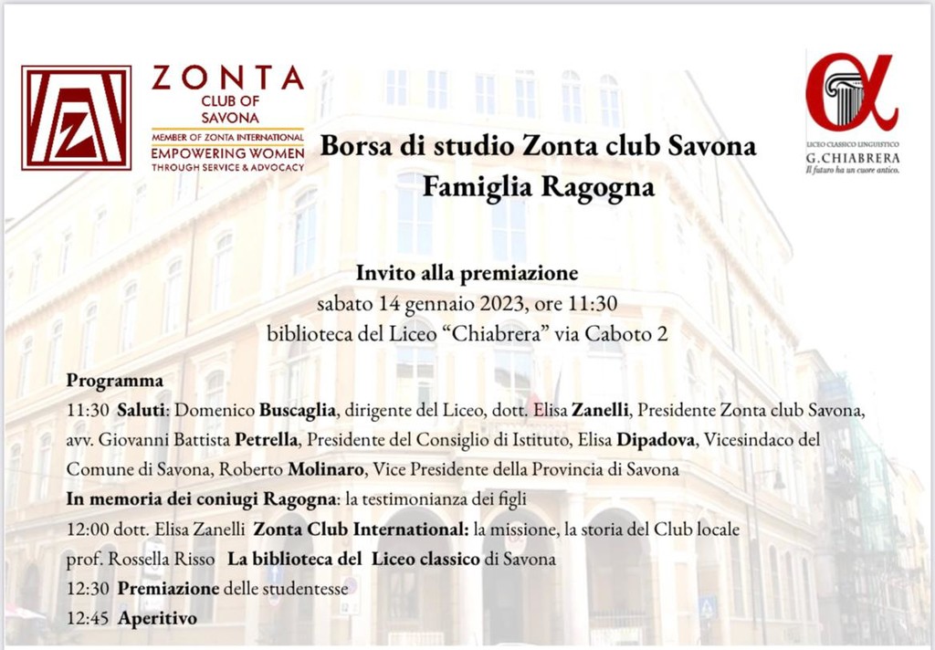 Lo Zonta Club di Savona, insieme al Liceo Classico “Chiabrera” di Savona, organizza per sabato 14 gennaio alle h 11:30, presso la Biblioteca del Liceo Chiabrera, un evento durante il quale verranno consegnate due borse di studio a due studentesse meritevoli del liceo, generosamente offerte dalla Famiglia Ragogna, e in particolare dalle figlie Gemma e Laura Ragogna in ricordo dei loro genitori.