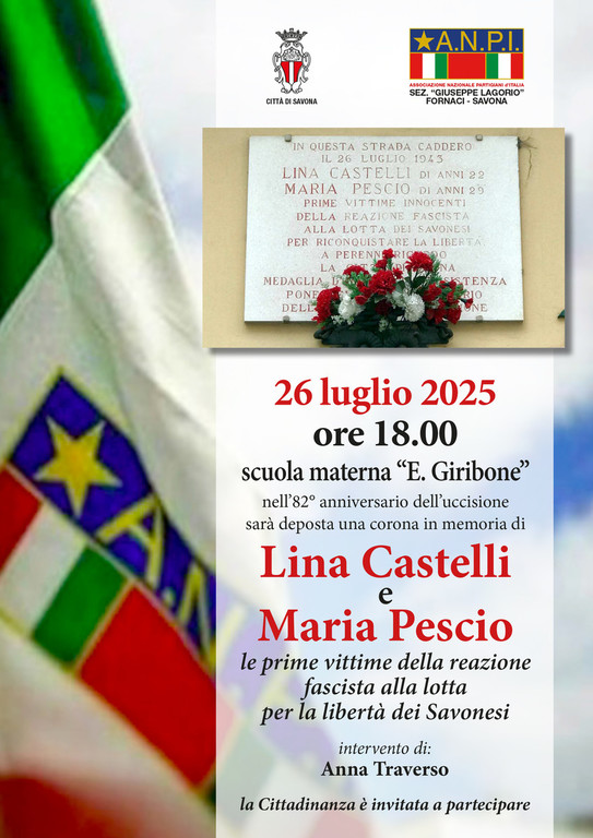 Nella giornata immediatamente successiva alla caduta del fascismo, anche a Savona si svolse, con uno sciopero generale, una grande manifestazione popolare a favore della pace: nel quartiere Fornaci, davanti alla caserma della Milizia Portuale (proprio l’attuale scuola dell’infanzia “Giribone”), una affollata dimostrazione chiese il disarmo dei militi e la cancellazione degli emblemi fascisti. L’ufficiale comandante della Milizia fece aprire il fuoco dalle finestre sulla folla, provocando una trentina di feriti e la morte di Lina Castelli e di Maria Pescio, di 29 che domani saranno ricordate come ogni anno.