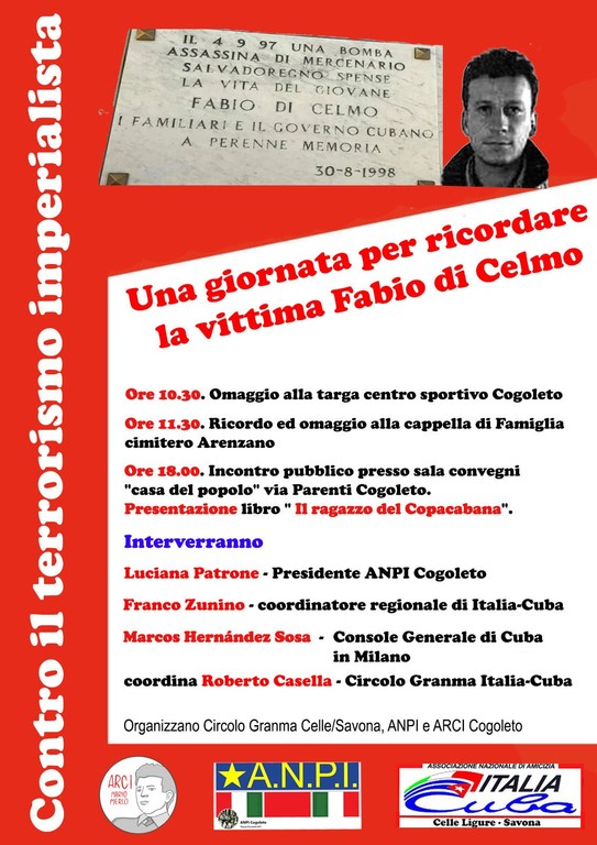 Il 4 settembre Fabio di Celmo verrà ricordato nel corso di un'iniziativa organizzata dal circolo Granma di Celle - Savona, Anpi e Arci Cogoleto.