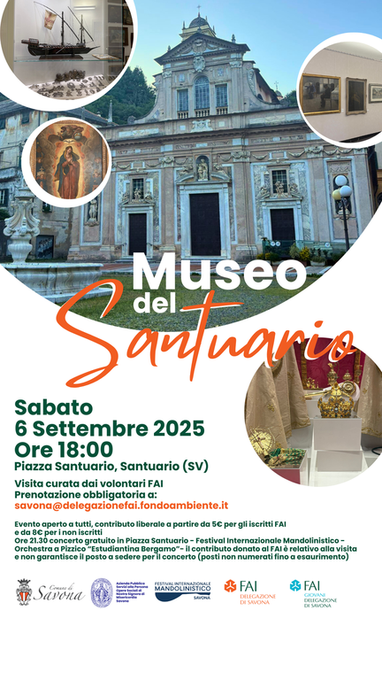 Alle visite delle ore 18.00 seguirà, alle ore 21.30, il concerto gratuito in Piazza Santuario tenuto dall’Orchestra a Pizzico “Estudiantina Bergamo” organizzato nell’ambito del Festival Internazionale Mandolinistico 2025 organizzato dal Comune di Savona. Si ricorda che il contributo liberale donato al FAI è relativo esclusivamente alla visita guidata e non garantisce il posto a sedere per il concerto, che resta a ingresso libero e con posti non numerati fino a esaurimento disponibilità.