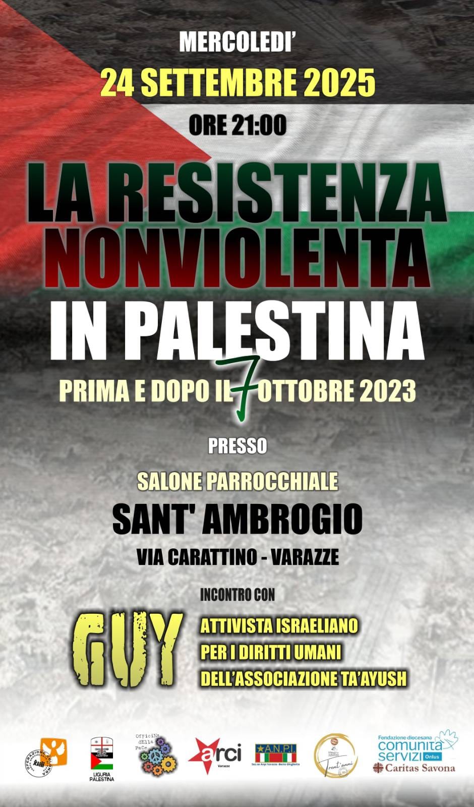 Operazione Colomba – Corpo nonviolento di pace organizza nel territorio savonese due appuntamenti insieme all’attivista israeliano Guy, in collaborazione con le associazioni Bottega del Commercio Equosolidale, Caritas di Savona, Fondazione Comunità e Servizi, Liguria Palestina, Officina della Pace, Comitato Provinciale Anpi Savona e la Sez.ne Anpi di Varazze, e Arci Varazze