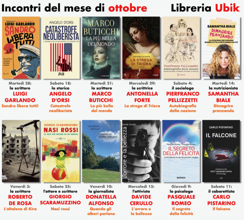 Riprendono gli eventi annuali della libreria Ubik. Negli eventi di ottobre spicca l'anteprima nazionale per la presentazione del libro sulla storia di Sandro Pertini ad opera dell'autore italiano attualmente più letto nelle scuole italiane, LUIGI GARLANDO.