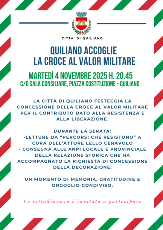 In occasione della tradizionale cerimonia del 4 novembre, Giornata dell’Unità Nazionale e delle Forze Armate, che si terrà in Piazza Mameli a Savona, il Gonfalone della Città di Quiliano sarà ufficialmente insignito della Croce al Valor Militare.