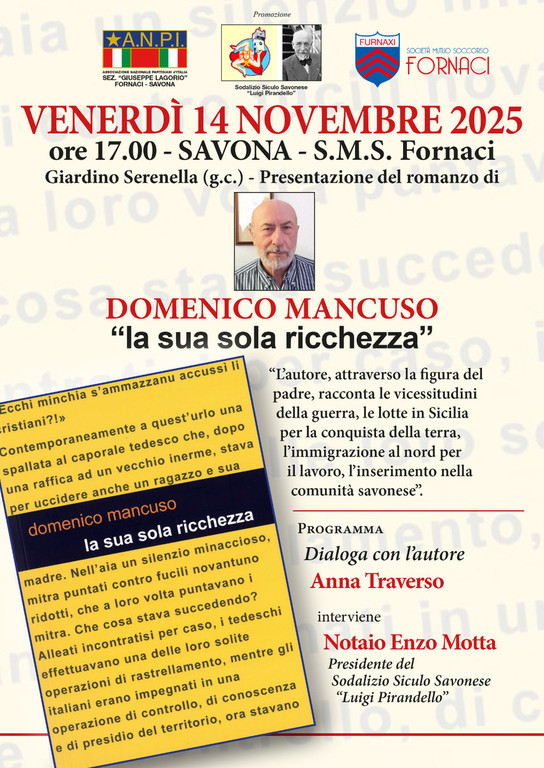 Venerdì 14 novembre alle ore 17,00 presso la S.M.S. Fornaci in C.so Vittorio Veneto 73r si terrà la presentazione del romanzo “La sua sola ricchezza” di Domenico Mancuso, in cui l’autore, attraverso la figura del padre, racconta le vicissitudini della guerra, le lotte in Sicilia per la conquista della terra, l’immigrazione al nord per il lavoro, l’inserimento nella comunità savonese.