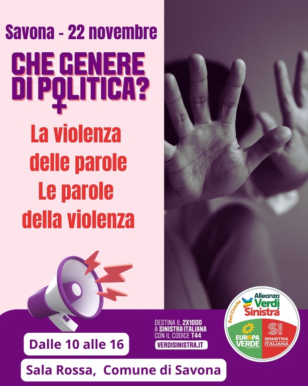 L'evento nazionale di AVS "Che genere di politica? La violenza delle parole, le parole della violenza" fa tappa in Liguria, a Savona. Una giornata per esplorare, con un approccio multidisciplinare, il potere del linguaggio nella costruzione delle relazioni sociali e nella riproduzione delle molteplici forme di violenza di genere. Nel corso della giornata, dalle 10 alle 16, si alterneranno numerosi panel con relatrici e relatori provenienti da ambiti diversi: