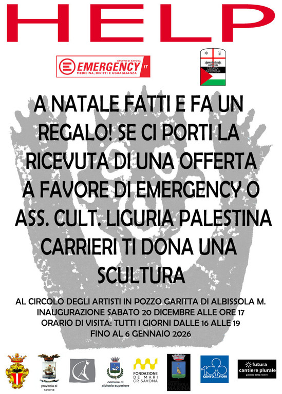 Tutte le sculture presentate al Circolo degli Artisti, che per l’occasione mette gratuitamente a disposizione gli spazi per la mostra, saranno regalate dall’autore alle persone che presenteranno la ricevuta di una donazione a favore di ”Associazione Culturale Liguria Palestina” oppure di “Emergency”. Indicazioni disponibili in Galleria.