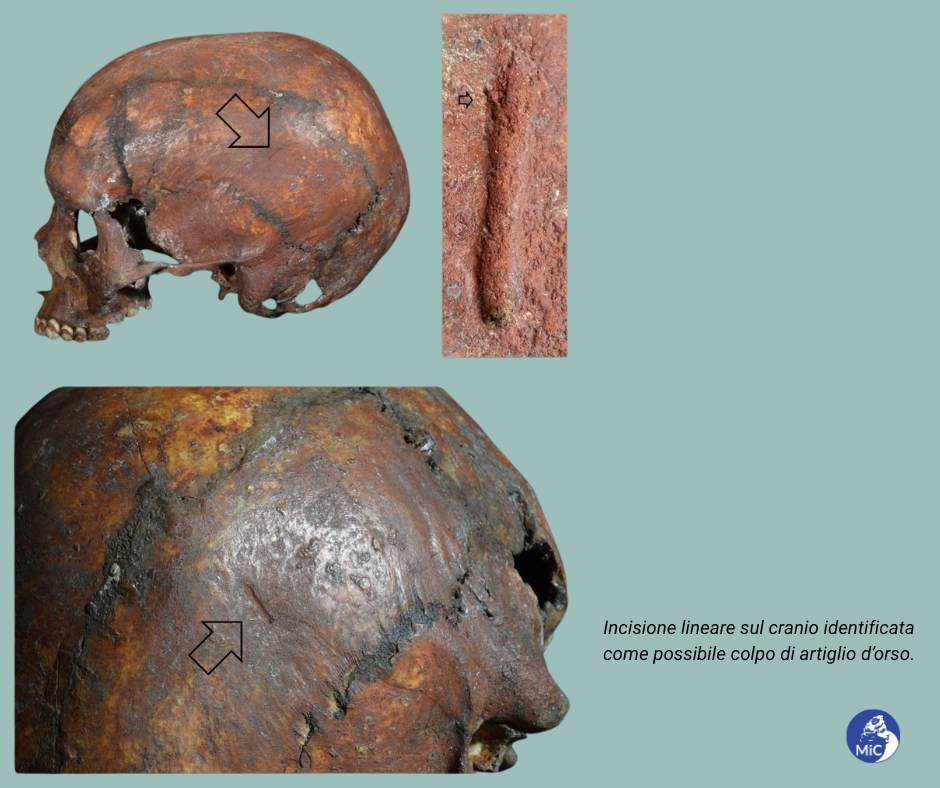 L’analisi, condotta da un team multidisciplinare — composto da ricercatori delle Università di Cagliari, Firenze, Genova, Pisa, della Soprintendenza Archeologia, belle arti e paesaggio per la Liguria, del Museo Civico di Archeologia Ligure, dell’Université de Montréal e del New Mexico Consortium — identifica una serie di traumi compatibili con un violento attacco da parte di un grande carnivoro, probabilmente un orso bruno o un orso delle caverne.