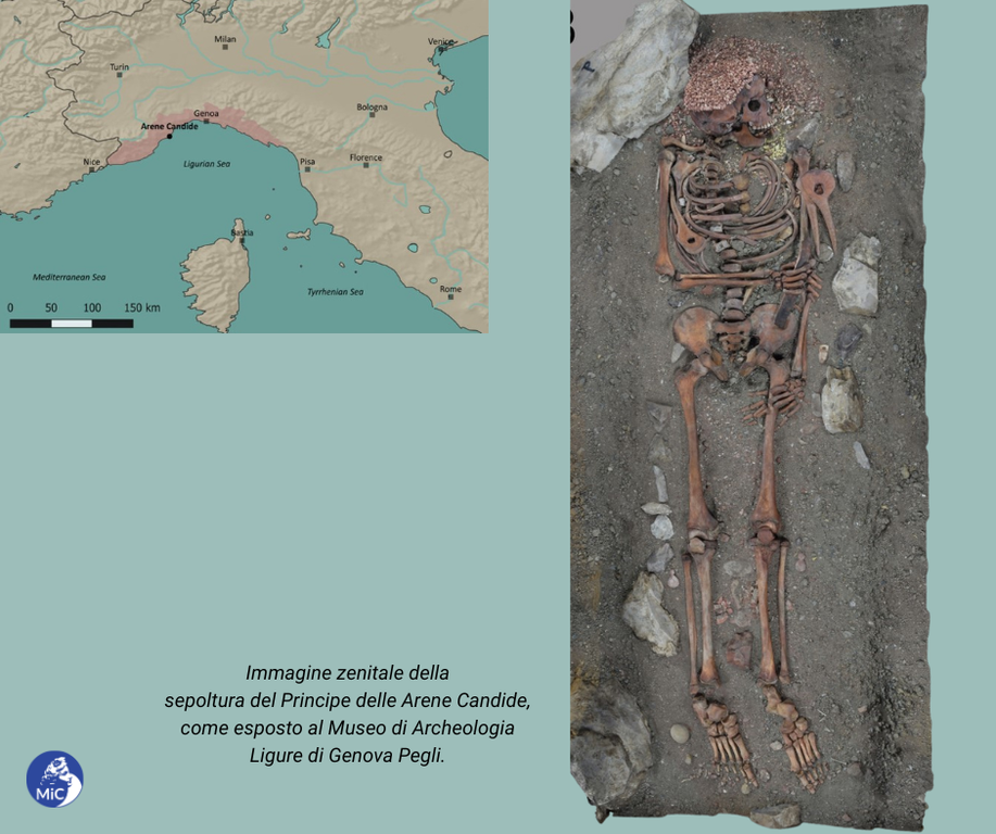 Il Principe, un adolescente vissuto circa 28.000 anni fa, è uno dei più iconici esempi di sepoltura gravettiana in Europa. La ricca deposizione funeraria, comprendente centinaia di conchiglie, pendenti in avorio e un’imponente lama in selce, è esposta da decenni al Museo di Archeologia Ligure di Genova Pegli.