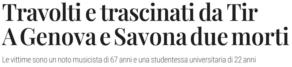 Aspettiamo, come tutti, le risultanze delle indagini sulla dinamica di questo ultimo tragico incidente, che si è oltretutto ripetuto con modalità pressoché identiche in serata a Sampierdarena, dove sotto le ruote di un TIR è morto Elio Arlandi, musicista.