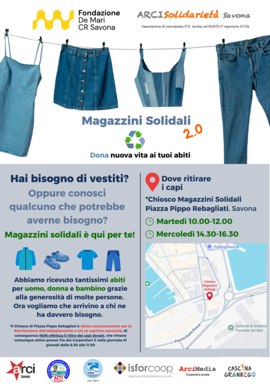 - Chiosco Magazzini Solidali, Piazza Pippo Rebagliati, Savona – Martedì dalle 10.00 alle 12; Mercoledì dalle 14.30 alle 16.30 (nota bene: il chiosco si occupa solo di distribuzione, non ritira i capi che s’intendono donare).