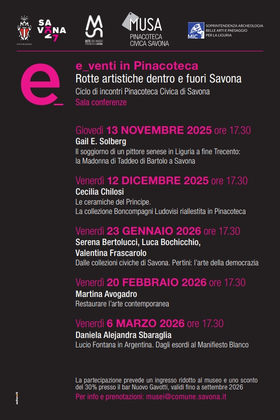 Il penultimo appuntamento con il ciclo di incontri in Pinacoteca, con approfondimenti di specialisti su opere e artisti legati a Savona e al suo territorio, si occuperà, il prossimo 20 febbraio alle ore 17,30 presso la sala Conferenze del Museo, di un argomento ancora poco noto al pubblico, ovvero il restauro dell'arte contemporanea. Si tratta di uno dei campi più complessi e problematici della conservazione, poiché mette in crisi tanto i principi teorici tradizionali quanto le pratiche operative consolidate.