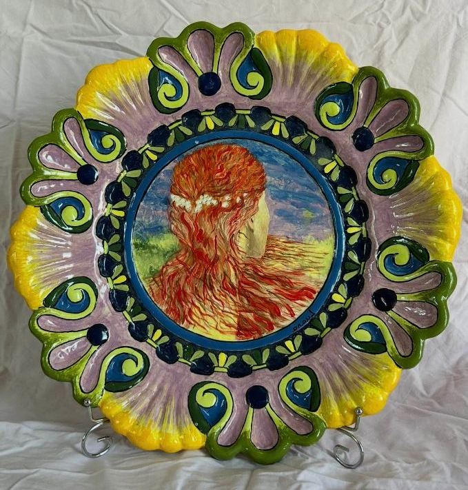 Luana LENZI (in copertina) segue, in qualche modo, la lezione nata ad Albissola Marina, Savona, Vado Ligure legata alla ceramica d’arte, basti pensare ai grandi Maestri innovatori in tal senso come Arturo Martini e Lucio Fontana, dove incanto e poesia dialogano con la innata capacità di giocare con terra, acqua e fuoco. Nasce, in tal modo, una sorta di suo visionario mondo che passa da alcuni rimandi essenziali al barocco (nelle tese dei suoi piatti) ad una singolare capacità alchemica di una tavolozza sgargiante, chiassosa espressione del suo “racconto” ceramico che lascia al pubblico il piacere di trovare, recuperare connessioni reali o immaginarie.