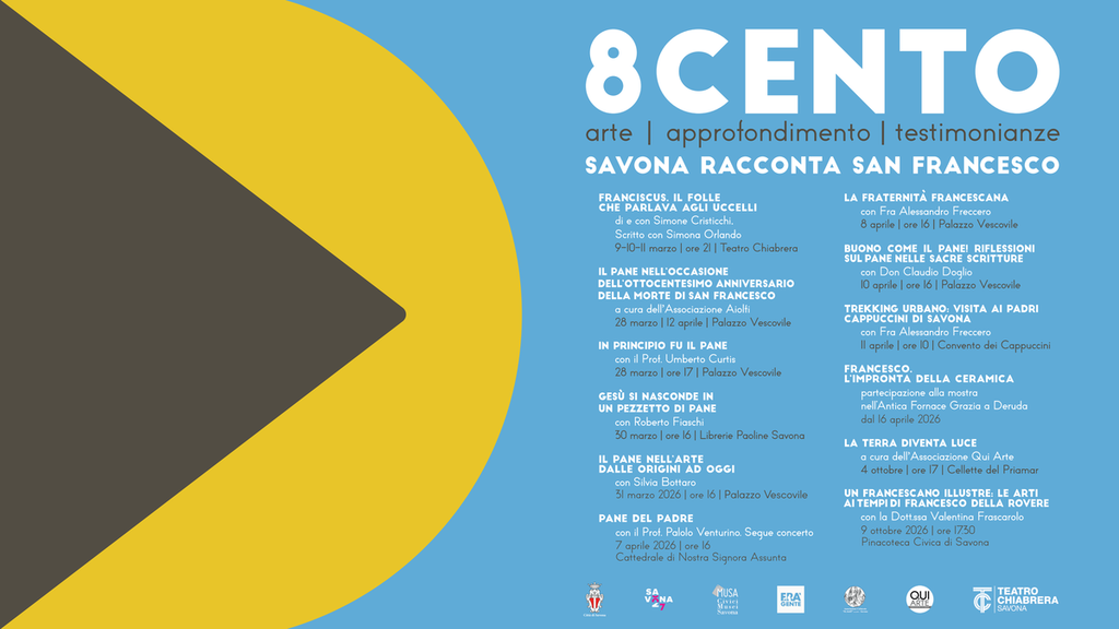 Il Comune di Savona in occasione delle celebrazioni dell’ottavo centenario della morte di Francesco d’Assisi presenta le iniziative che in collaborazione con il Teatro Chiabrera, la Pinacoteca Civica, la Città di Deruta, alcune Associazioni culturali del territorio ed i Frati Capuccini di Savona promuoveranno la conoscenza e l’attualità del messaggio del Santo.