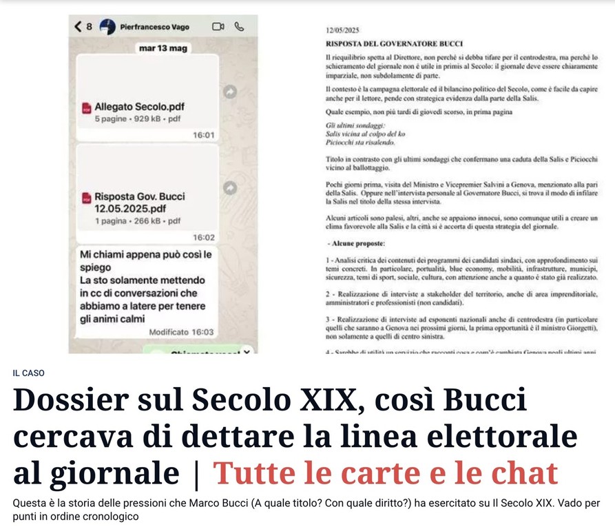 Pubblichiamo anche i dossier che sono online sulla pagina del Secolo (qui, qui e qui) e l’interessante file intitolato ‘Indicazioni elettorali Bucci date al mio editore’, anch’esso disponibile sul sito del quotidiano.